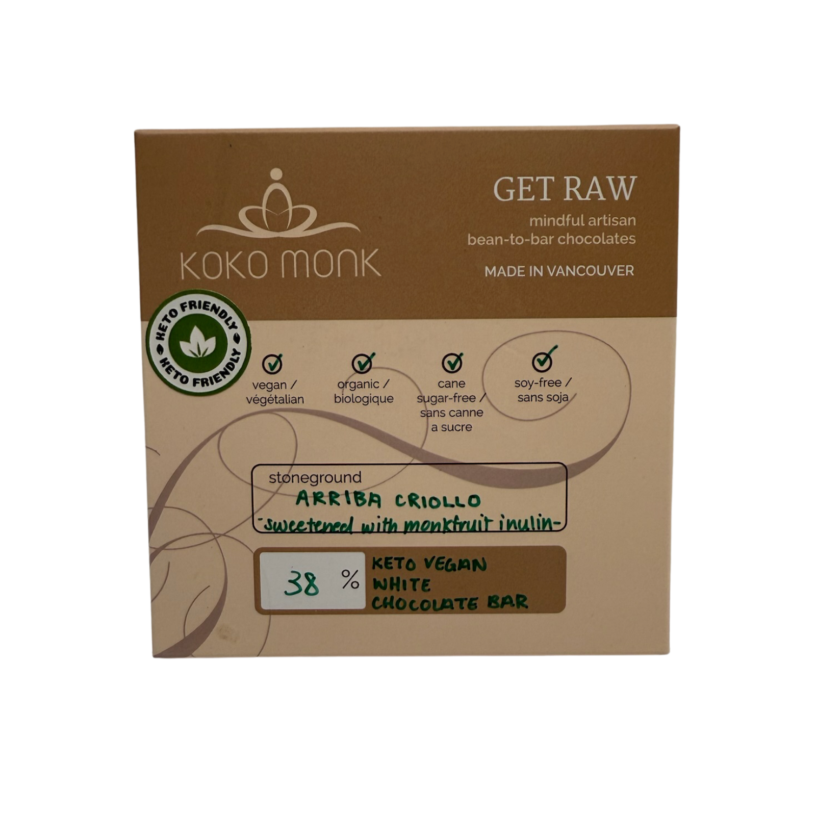 38% Keto Vegan White Chocolate Bar sweetened with Monk Fruit Inulin.