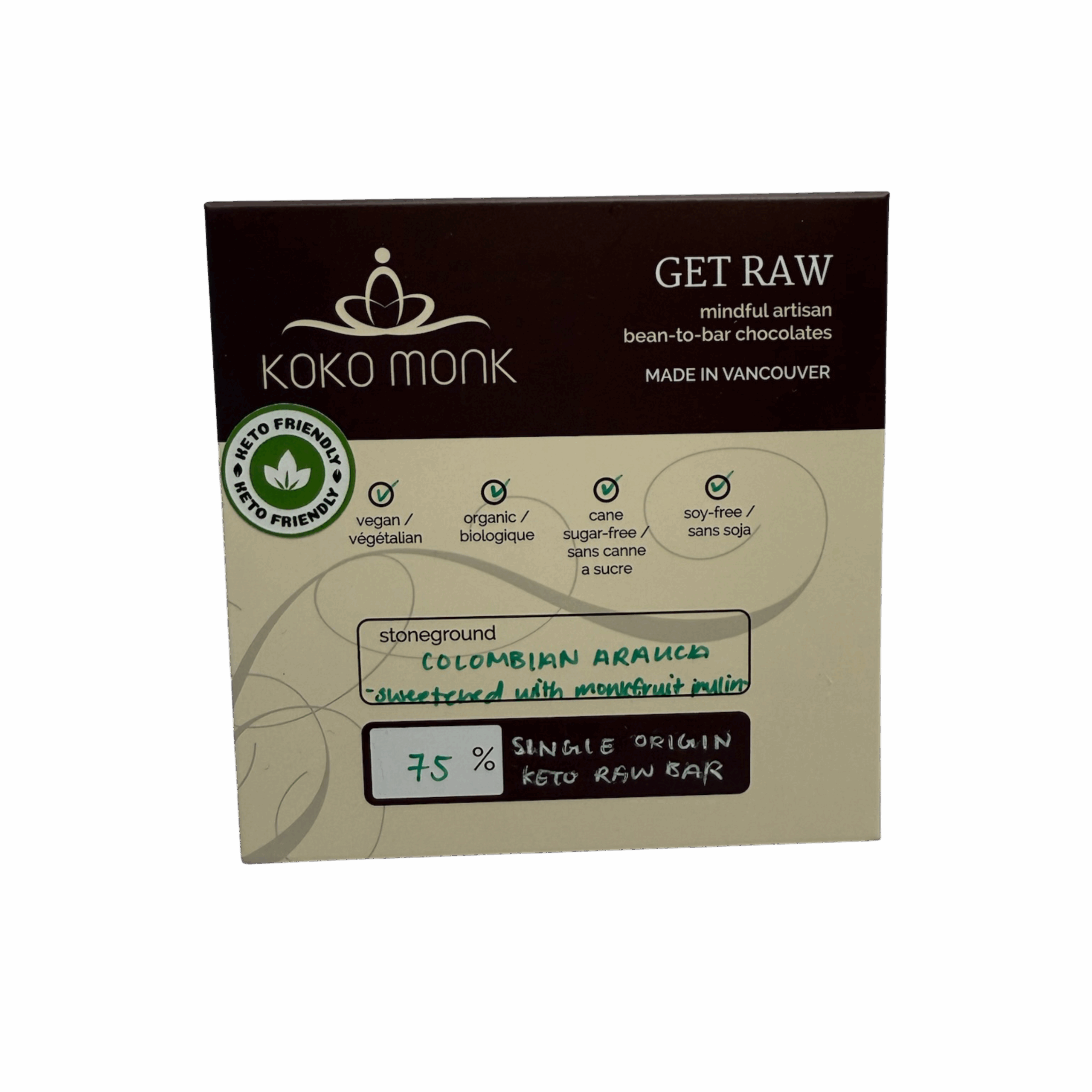 75% Single Origin Keto Raw Bar sweetened with Monk Fruit Inulin.