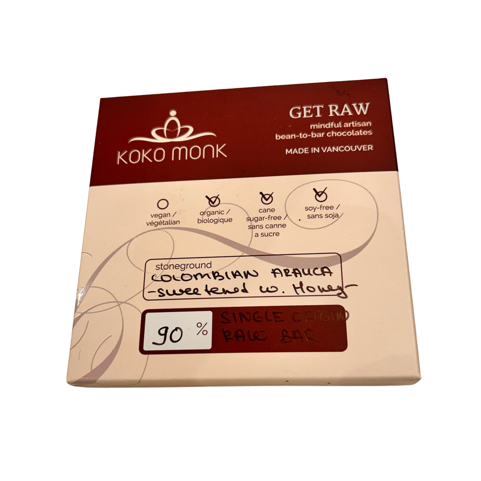 90% Premium Single Origin Raw Bar sweetened with Honey.